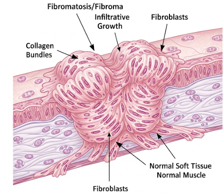 Fibromatosis refers to a group of rare, benign (non-cancerous) but locally aggressive soft tissue tumors that arise from fibroblasts (cells responsible for connective tissue formation). Unlike typical tumors, fibromatosis does not metastasize (spread to distant organs), but it can invade surrounding tissues and cause significant complications.