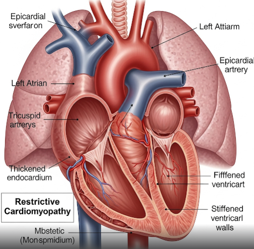 RCM is a condition where the heart muscle loses its elasticity without becoming thickened (as in hypertrophic cardiomyopathy) or weakened (as in dilated cardiomyopathy). This stiffness prevents the ventricles from expanding enough to accommodate blood returning from the body and lungs, leading to reduced cardiac output and congestion. It can be idiopathic or secondary to conditions like amyloidosis, sarcoidosis, or endomyocardial fibrosis.