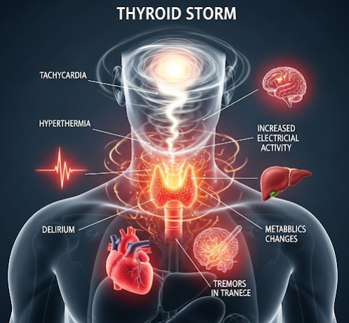 Thyroid storm, also called thyrotoxic crisis, occurs when the body experiences an acute surge of thyroid hormones, leading to exaggerated symptoms of hyperthyroidism. It often develops in patients with untreated or poorly controlled hyperthyroidism, particularly Graves’ disease. Triggers can include infection, surgery, trauma, or discontinuation of anti-thyroid medications. Unlike typical hyperthyroidism, thyroid storm presents with severe systemic effects and requires immediate hospitalization. Without prompt treatment, it can progress to multi-organ failure.