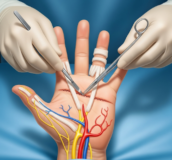 - Tissue removal: Thickened cords are excised or released to allow finger extension