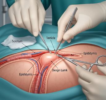 Surgery for benign scrotal lumps is a medical procedure to remove non-cancerous growths in the scrotum, such as epididymal cysts, hydroceles, lipomas, or spermatoceles. These lumps, while often harmless, may cause discomfort, pain, or cosmetic concerns, and surgical removal is recommended if symptomatic or growing.