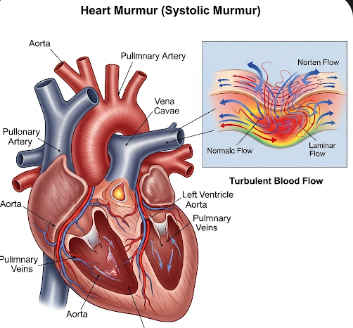 A heart murmur is an abnormal sound heard during a heartbeat, often described as a whooshing or swishing noise. Murmurs are caused by turbulent blood flow within the heart or near its valves. While some murmurs are harmless (innocent), others may indicate underlying heart conditions, including valve disorders, congenital defects, or other cardiovascular issues.