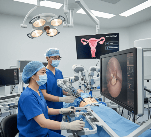 • Robotic-assisted hysterectomy: Performed with robotic arms for greater precision and reduced recovery time