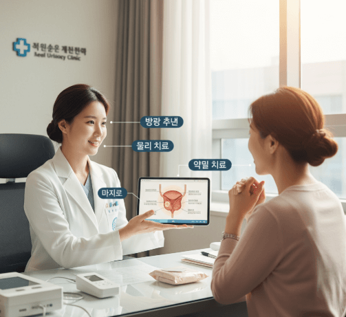 Urinary incontinence treatment in Korea follows a step-by-step approach, starting with conservative methods and progressing to medical or surgical solutions if needed.