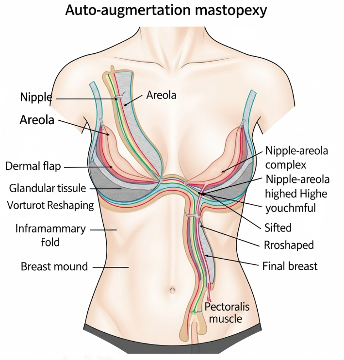 Auto-augmentation mastopexy is a specialized breast lift procedure that uses the patient’s own breast tissue to enhance fullness and shape while lifting sagging breasts. Unlike traditional mastopexy, which only removes excess skin and lifts the tissue, this technique reshapes and repositions lower breast tissue into the upper pole to provide natural volume and projection.
