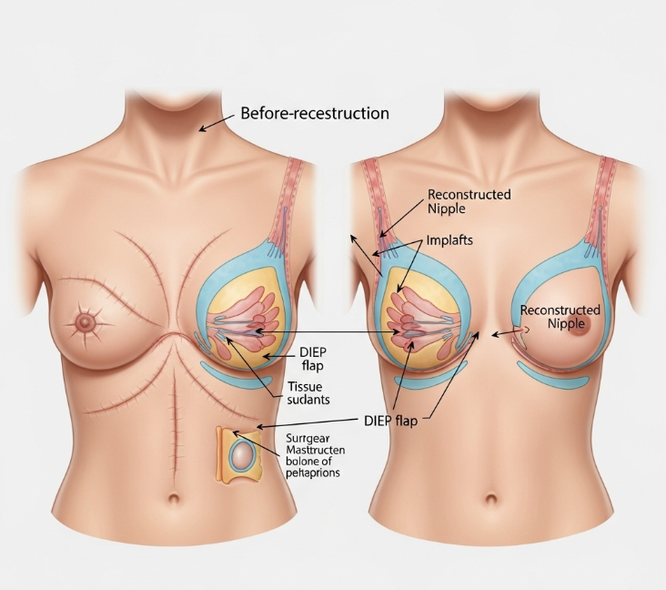 - Autologous reconstruction (flap): Uses patient’s own tissue (e.g., DIEP flap, TRAM flap, latissimus dorsi flap).