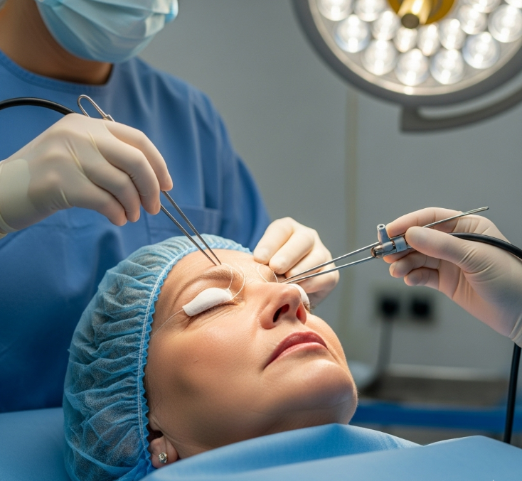 Eyelid ptosis frontalis sling surgery is a reconstructive procedure used to treat severe drooping of the upper eyelid (ptosis) when the levator muscle (the main muscle that lifts the eyelid) is too weak to function properly. In this surgery, the eyelid is connected to the frontalis muscle in the forehead using a sling made of silicone, fascia, or other biocompatible material. This allows the patient to lift the eyelid by raising their eyebrows.
