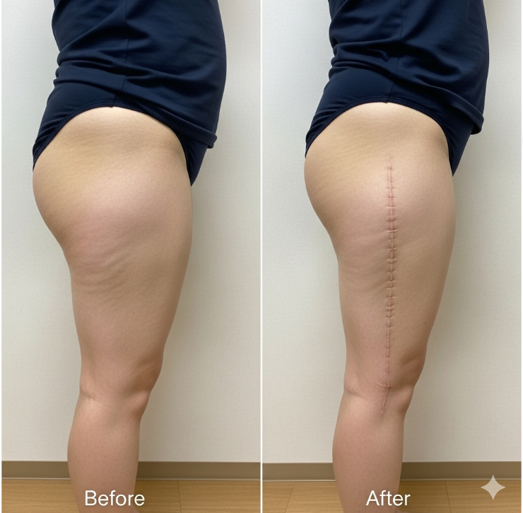 The procedure improves both leg aesthetics and body proportions, especially for patients concerned with drooping skin or stubborn fat on the outer thighs.