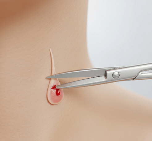 - Snipping → Dermatologist uses fine surgical scissors or a scalpel to cut the tag at its base.