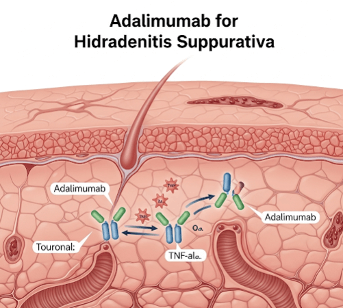 ➝ By blocking TNF-α, adalimumab reduces the chronic inflammation that causes painful nodules, abscesses, and sinus tracts.