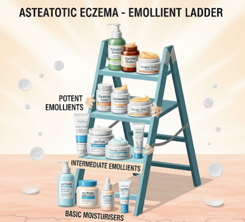 ➝ The mainstay of therapy is regular emollient use, and dermatologists often prescribe an “emollient ladder” – a stepwise approach to moisturization depending on disease severity.