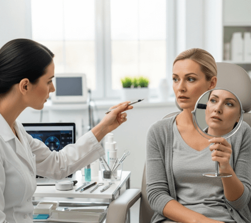 → During a consult, dermatologists assess skin type, texture, tone, age-related changes, and cosmetic concerns such as acne scars, pigmentation, wrinkles, fine lines, enlarged pores, and uneven complexion.
