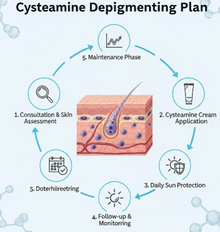 Cysteamine depigmenting plan in Korea is a medical skincare program that uses cysteamine cream as a topical treatment to reduce excess pigmentation caused by melasma, post-inflammatory hyperpigmentation (PIH), lentigines, and other pigmentary disorders.
