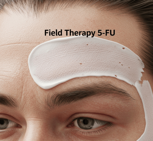 → Field therapy with 5-FU (5-fluorouracil) is a topical dermatological treatment used to target areas of skin that have developed actinic keratoses (precancerous lesions caused by chronic sun exposure) and other forms of actinic damage.