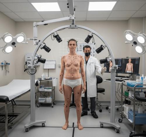 → High-resolution images are taken of the entire body and stored digitally. These serve as a baseline reference so dermatologists can compare and track changes in moles over time.