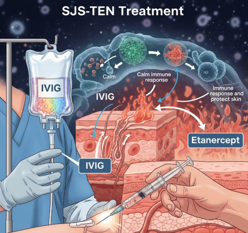 ➝ IVIG (intravenous immunoglobulin) and etanercept (TNF-α inhibitor) are immunomodulatory therapies used in specialized centers, aiming to stop disease progression by blocking pathways of keratinocyte apoptosis and inflammation.