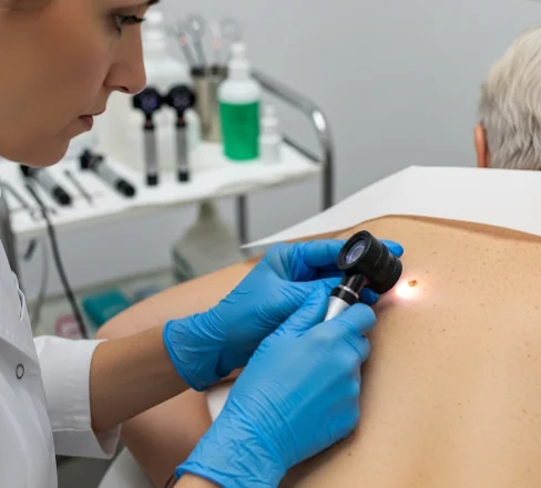 - Visual inspection → dermatologist examines the skin from head to toe, including scalp, nails, between fingers and toes, and hidden areas.