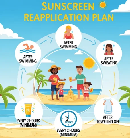 A sunscreen reapplication plan is a structured skincare guideline that ensures consistent UV protection throughout the day. Sunscreen naturally breaks down, wears off due to sweating, sebum, or friction, and loses effectiveness after a few hours. Reapplication is crucial to prevent sunburn, pigmentation (melasma, freckles, PIH), and photoaging (wrinkles, sagging, dullness).