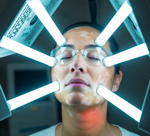 Phototherapy for vitiligo is a dermatological treatment that uses ultraviolet (UV) light to stimulate melanocytes — the pigment-producing cells in the skin. The goal is to encourage repigmentation in depigmented patches by reactivating surviving melanocytes and promoting melanin distribution.